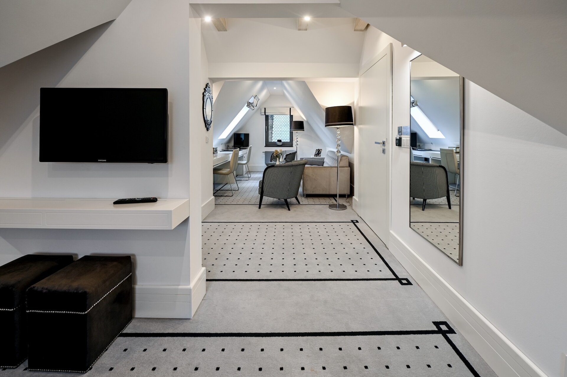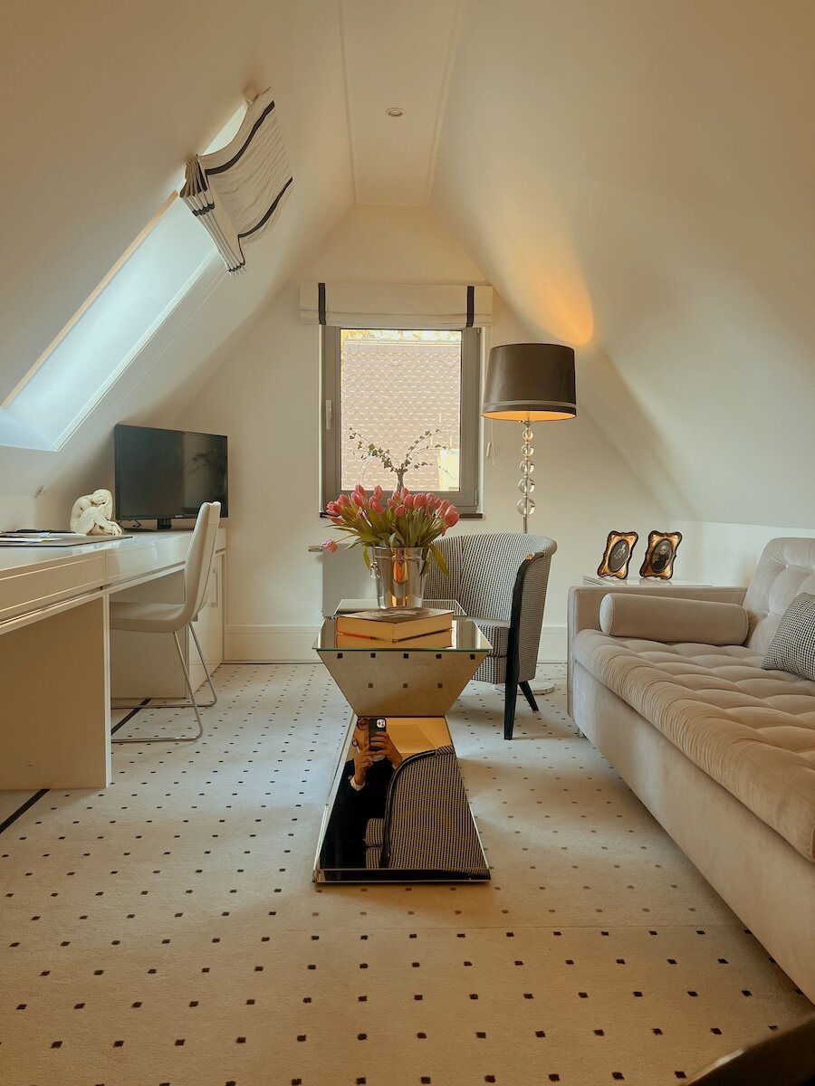 Zajmujący 50,5 metra kwadratowego apartament mieści się na poddaszu, co nadaje mu niepowtarzalny charakter i atmosferę - okna tradycyjne oraz dachowe wpuszczają do wnętrza mnóstwo naturalnego światła, tworząc atmosferę pełną harmonii i spokoju. Część sypialna zachwyca elegancją, zaś część dzienna stanowi prawdziwą ostoje relaksu.