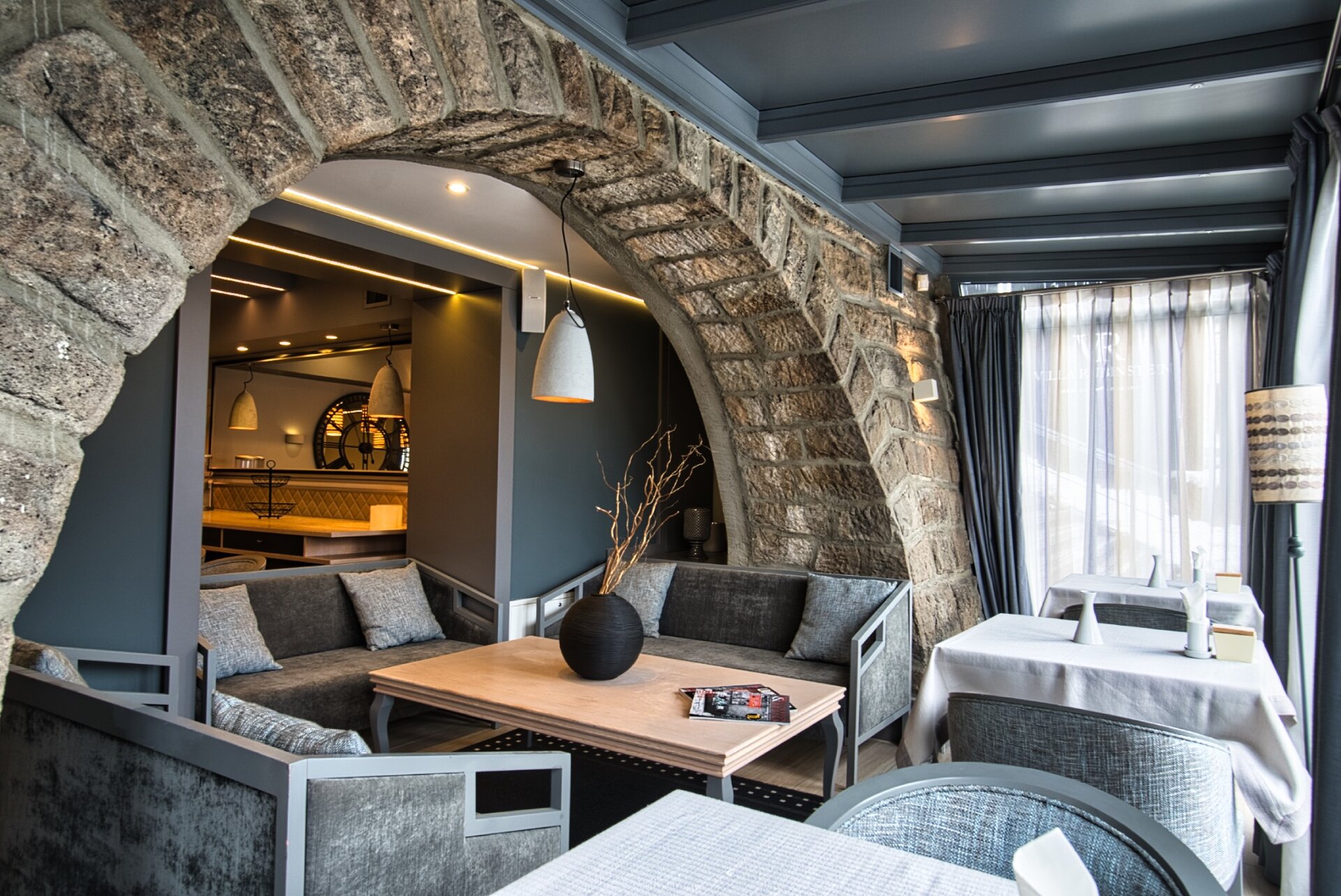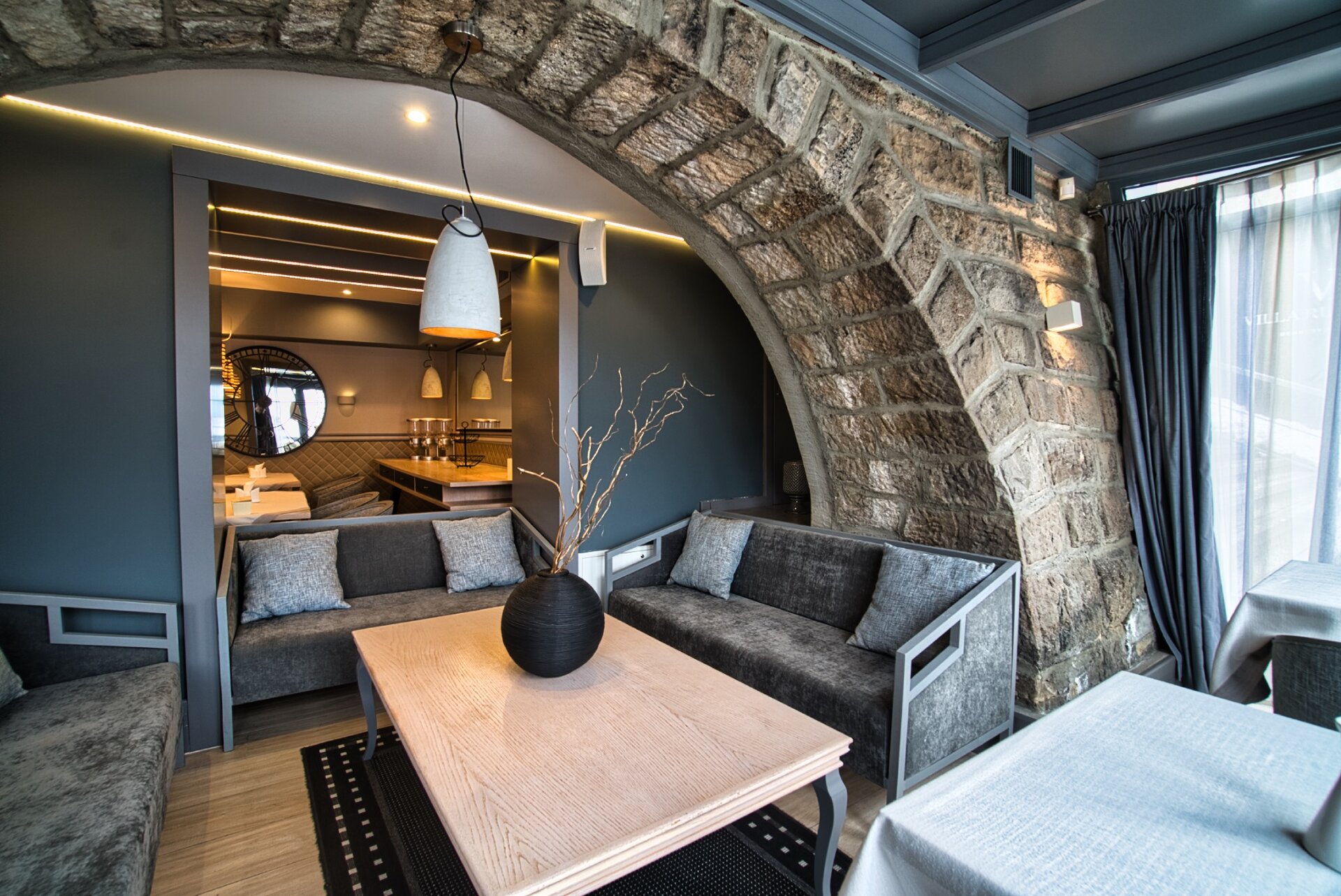 Item20, Link to Larger Image, pokój z kamiennym łukiem oraz stołem i kanapami