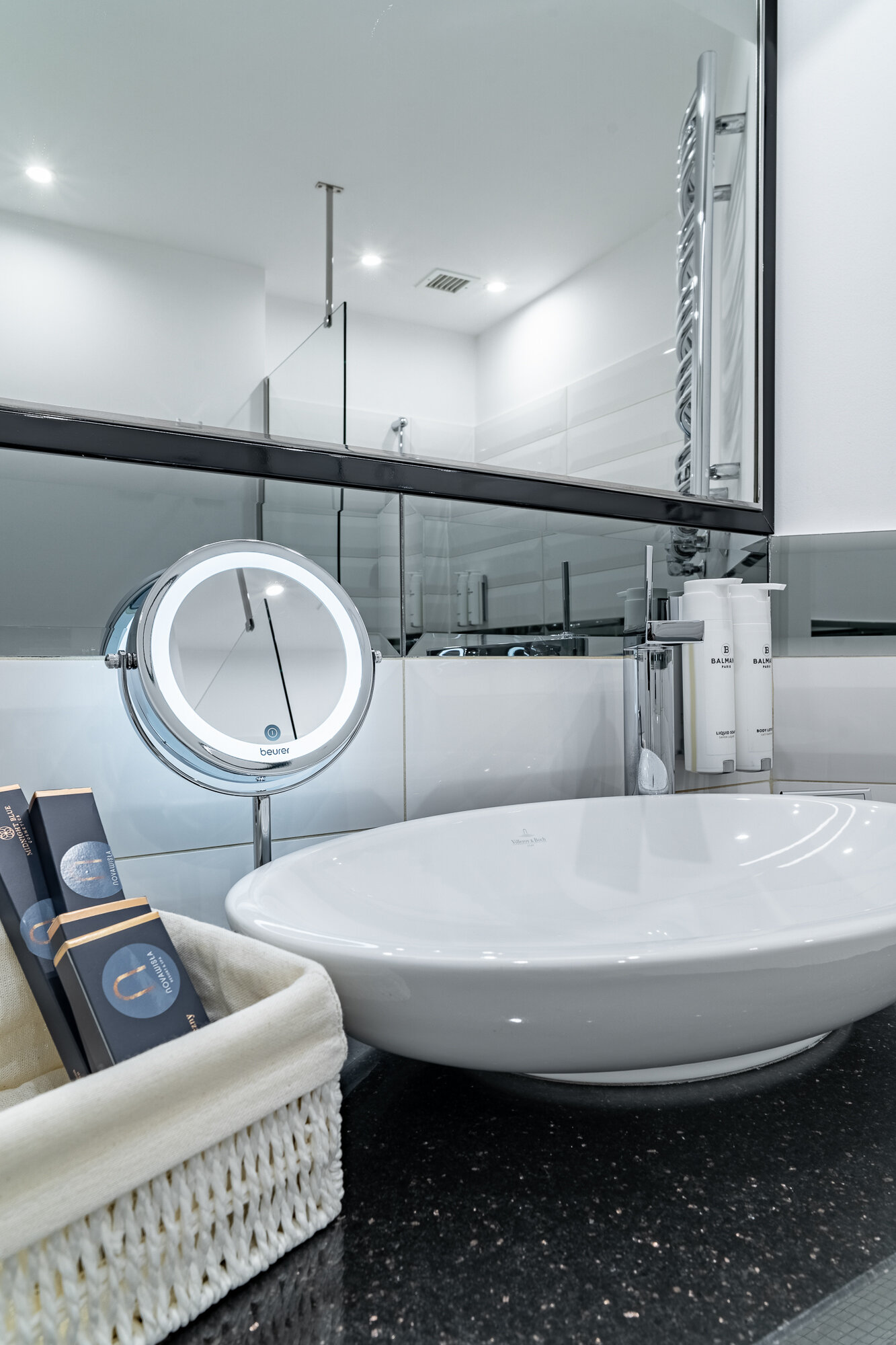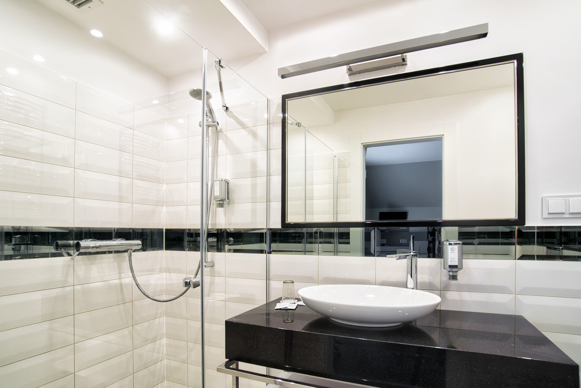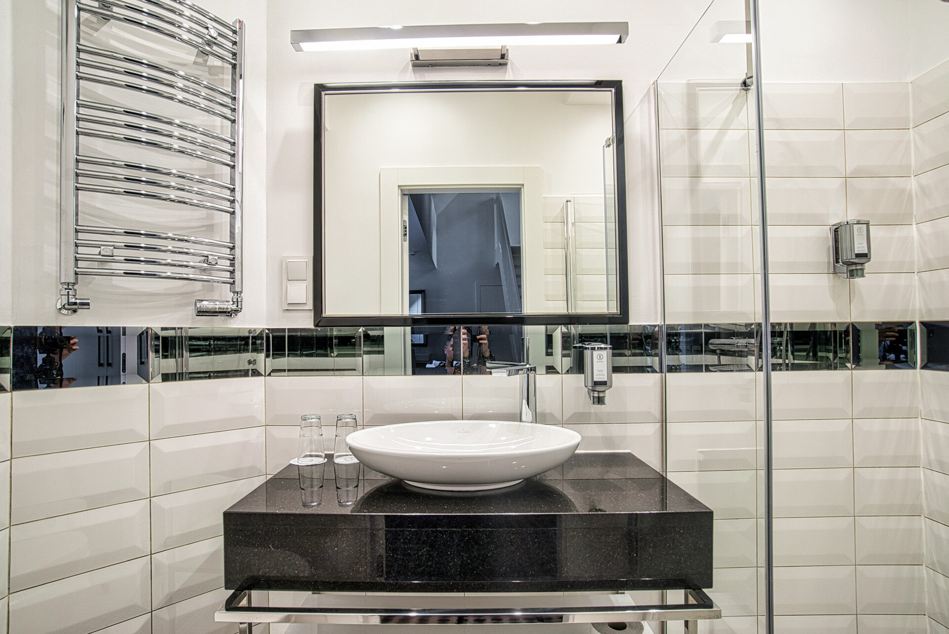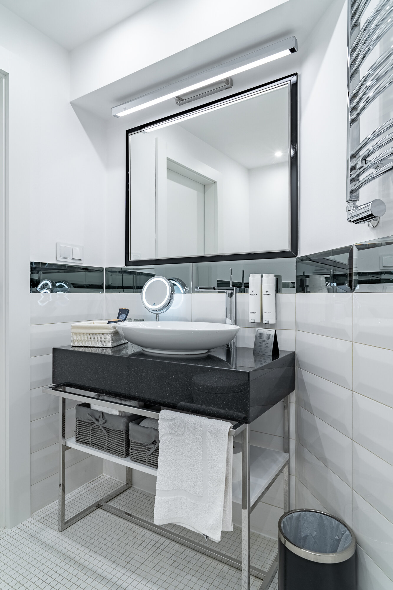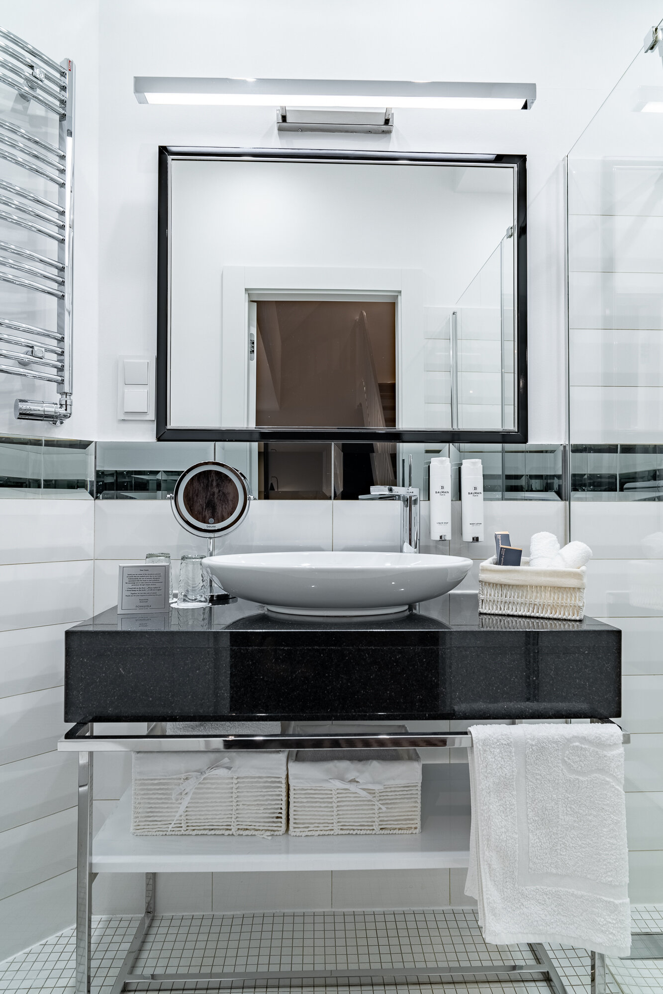 Item42, Link to Larger Image, łazienka z czarnym blatem, umywalką i lustrem
