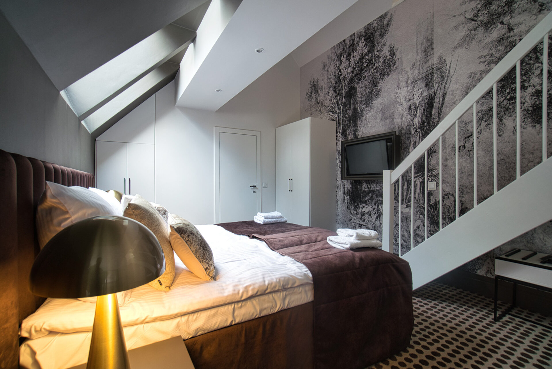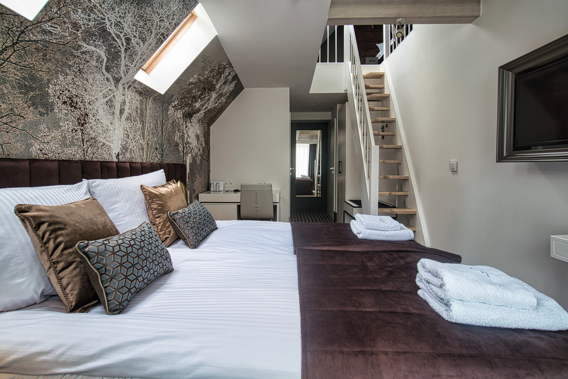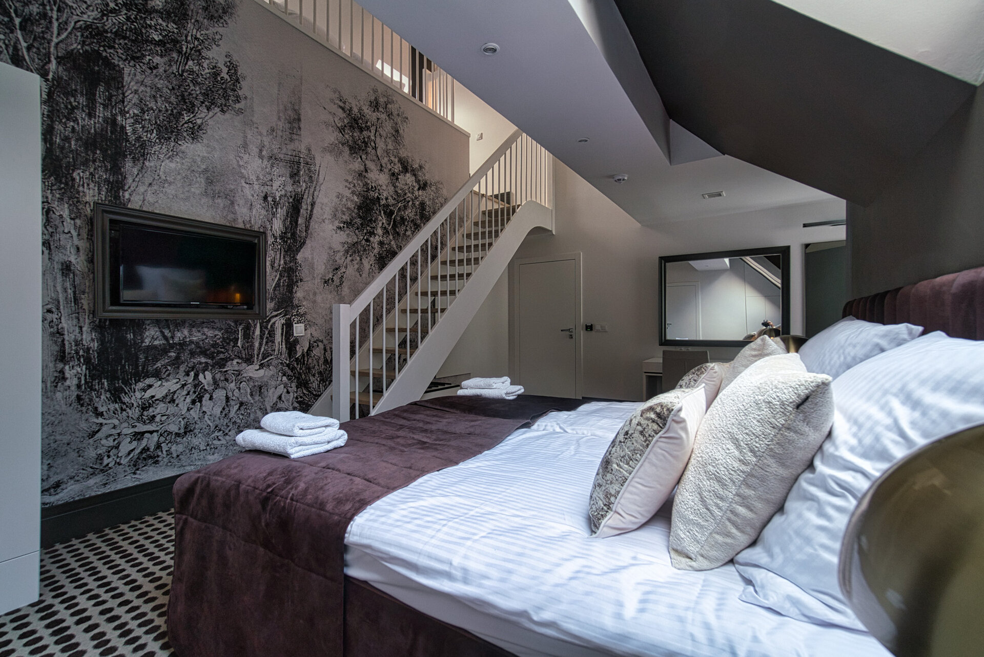 Item23, Link to Larger Image, łóżko z poduszkami i telewizorem w pokoju ze schodami