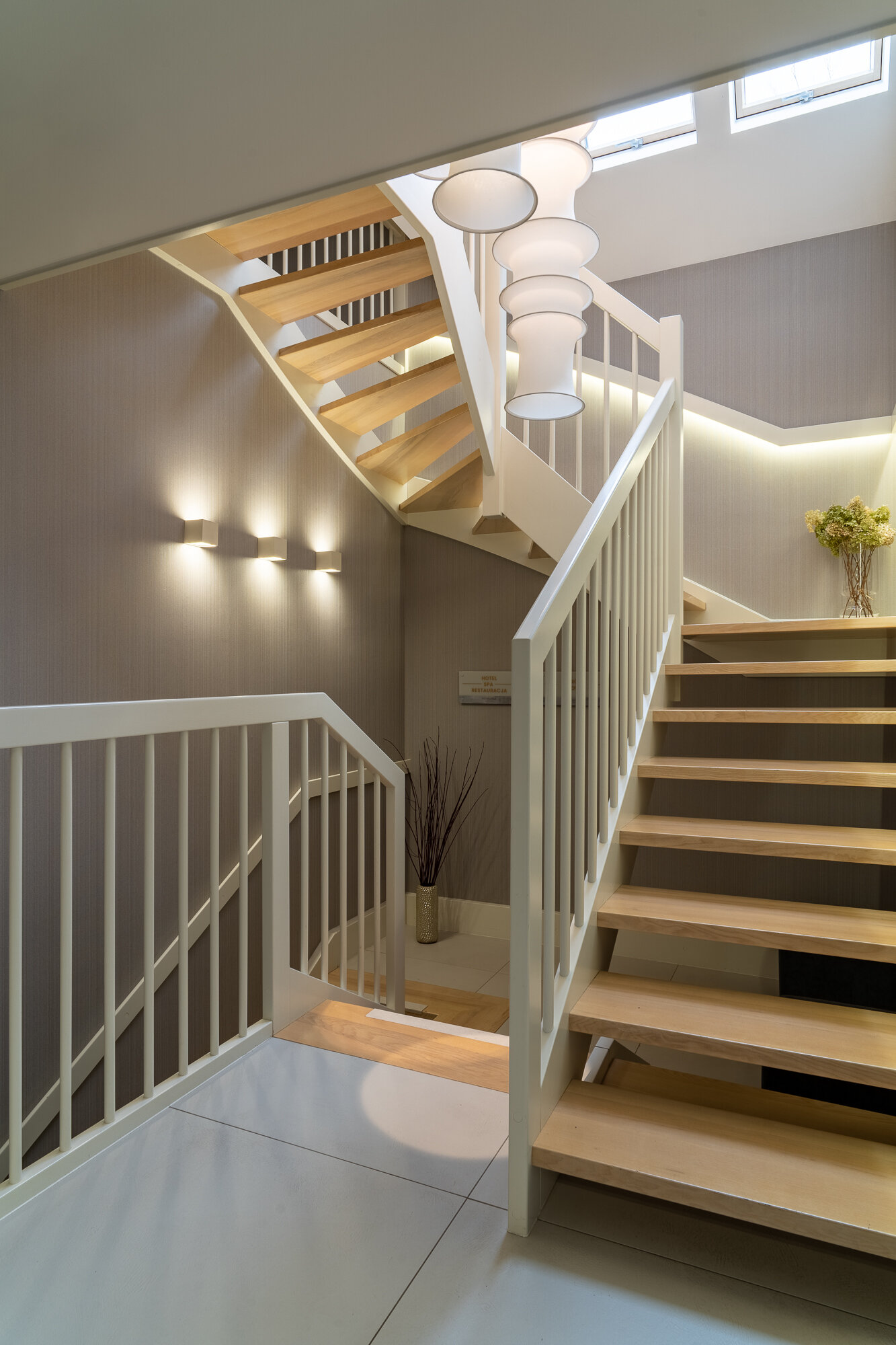 Item36, Link to Larger Image, schody z białymi balustradami i oprawą oświetleniową