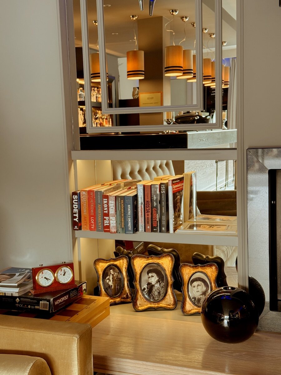 Item72, Link to Larger Image, półka z książkami i ramkami na zdjęcia