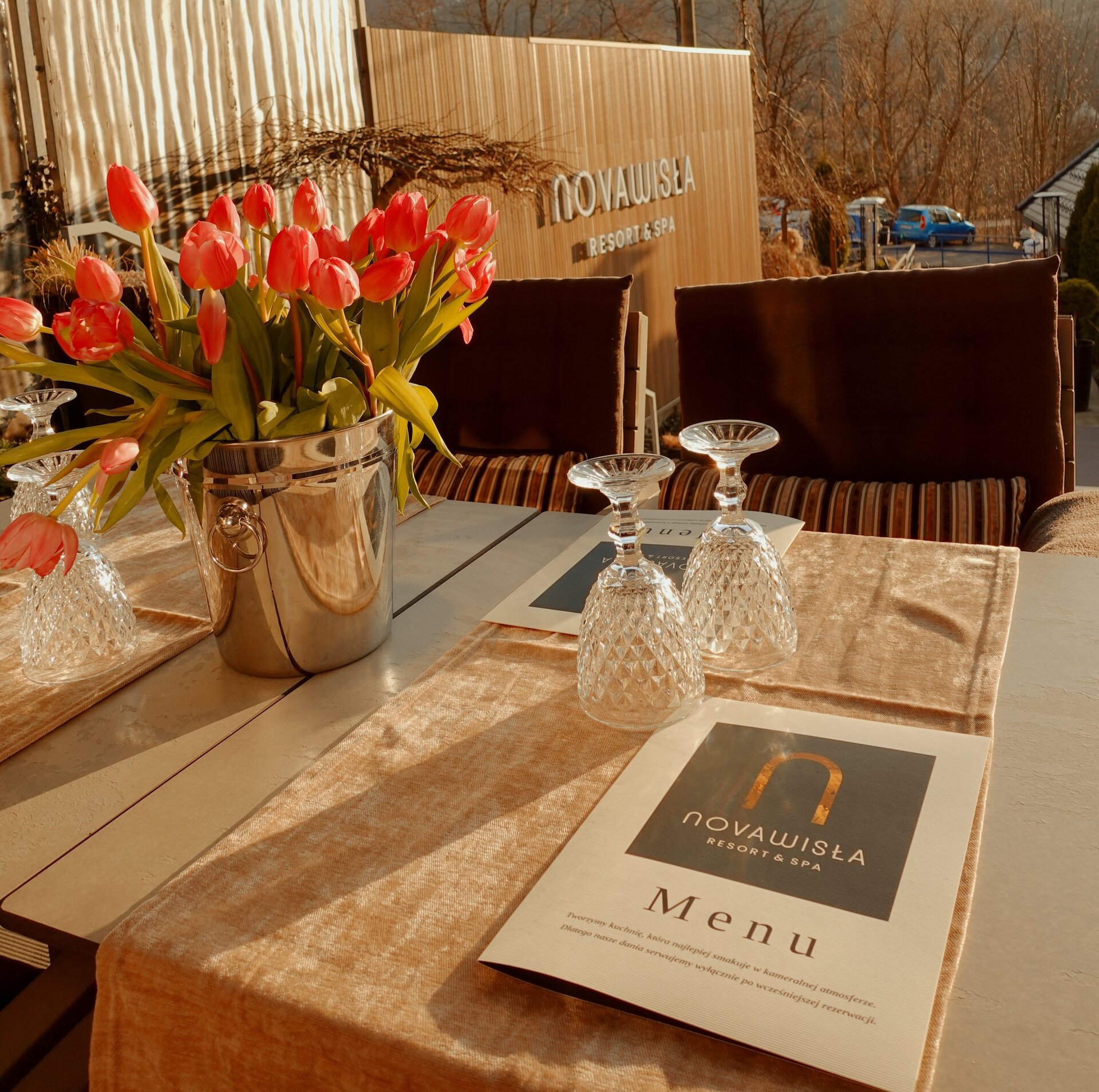 Item87, Link to Larger Image, stół z wazonem kwiatów i menu na nim
